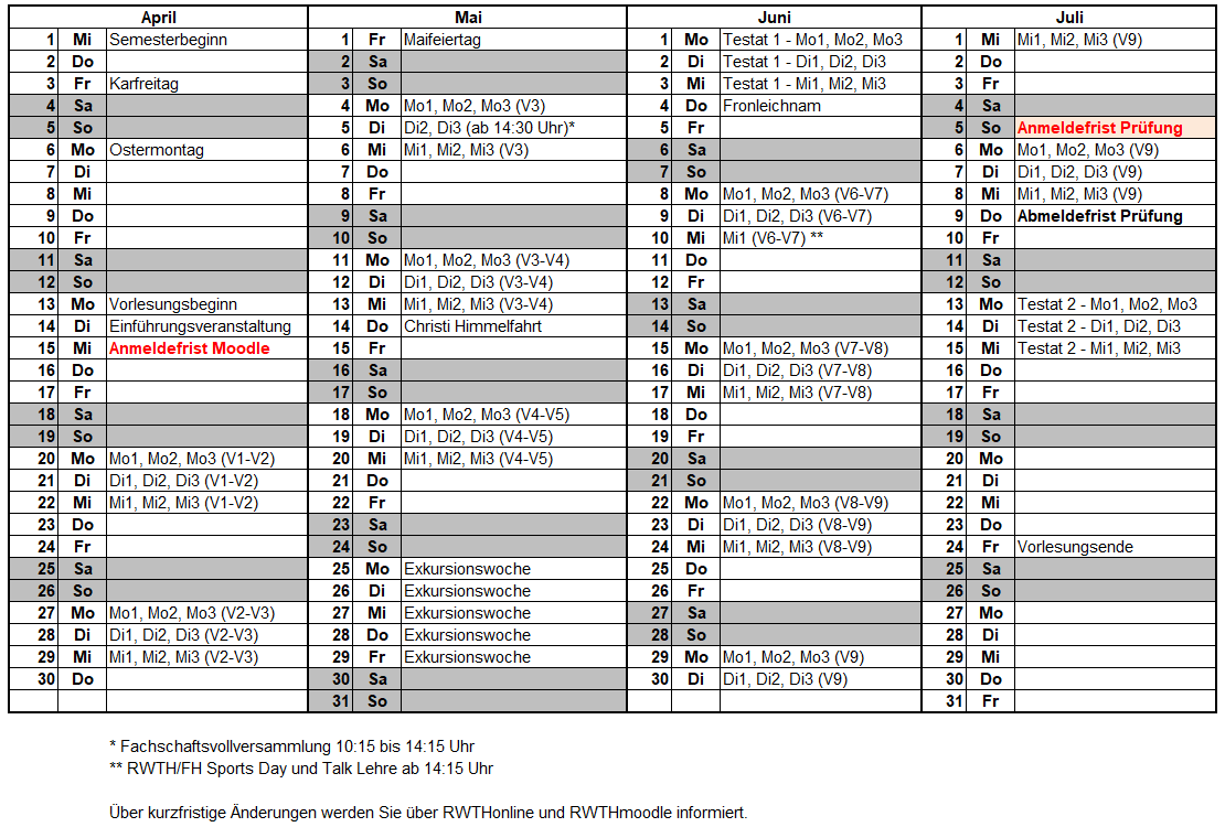 Es werden mehrere Praktikumstermine in der Woche angeboten s.u. Während des modularen Anmeldeverfahrens wird Ihnen ein Termin zugeteilt. Achten Sie auf Verschiebungen aufgrund von vorlesungsfreien Tagen. Diese werden in RWTHonline gepflegt.